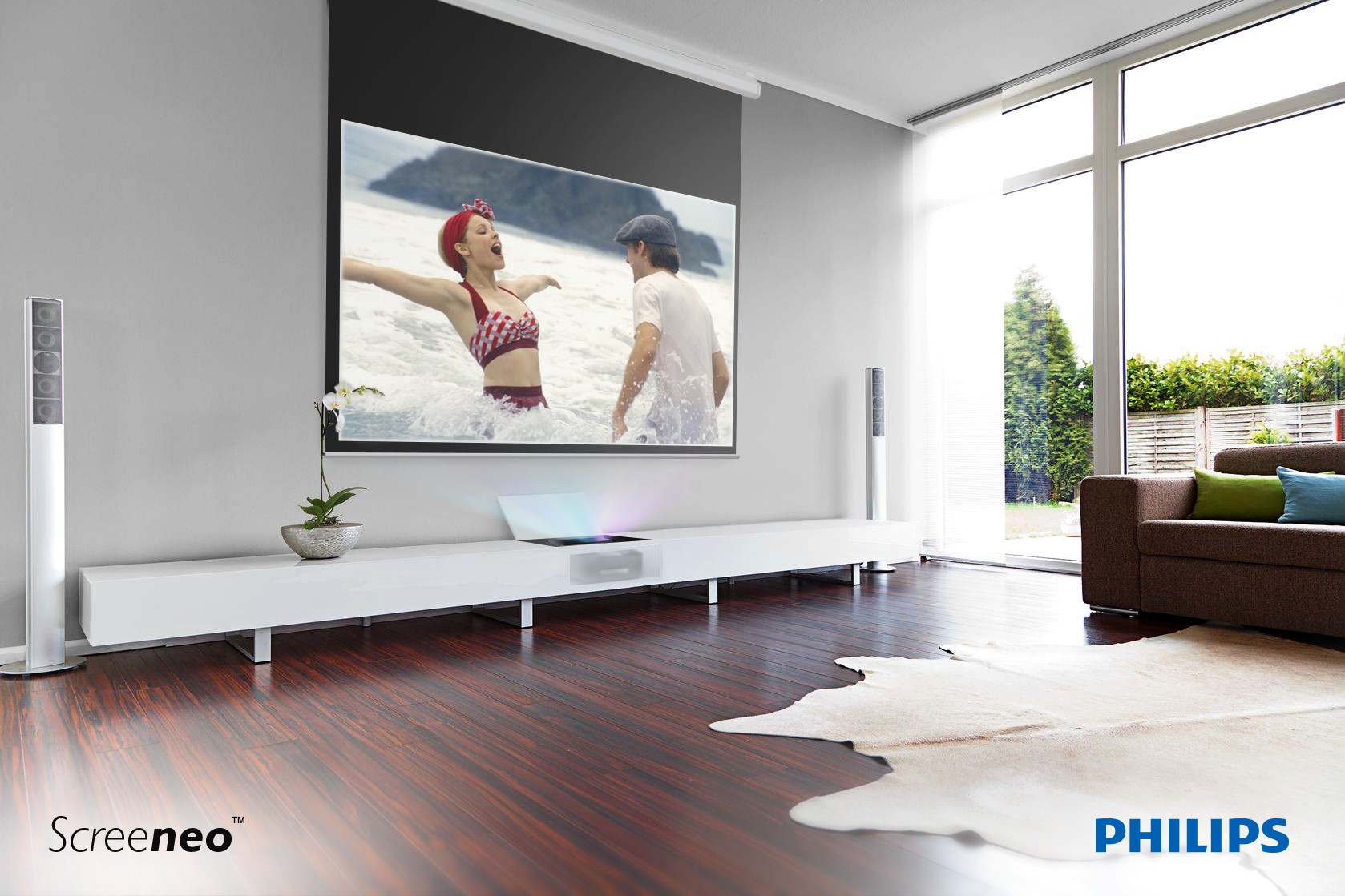 Sama technologia ultra-krótkiego rzutu ma jedną podstawową zaletę. Nawet w niewielkim salonie możemy cieszyć się pełnowymiarową projekcją. W przypadku Philips Screeneo strumień światła pada bezpośrednio na ścianę nad projektorem, dzięki czemu nie musimy martwić się tym, że ktokolwiek przeszkodzi nam w rozkoszowaniu się kinowym seansem.